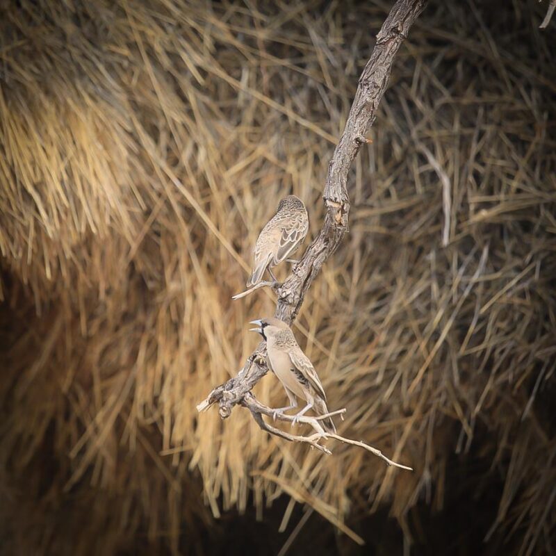 Po chwili samochód zatrzymuje się ponownie w pobliżu rozłożystego drzewem. Świergot wydobywający się z kilkudziesięciu małych gardełek słyszymy jeszcze długo przedtem zanim kierowca wyłączy silnik. Olbrzymie gniazda otulają grube konary.
