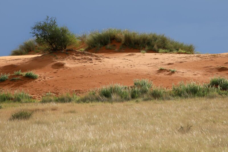 Nasze auto wgryza się oponami w piasek wydmy. Silnik stęka wspinając się po zboczu. Po drugiej stronie pasą się skoczki antylopie. Ich futerko lśni w słońcu jak aksamit — krótkie, gładkie, w ciepłych rudawych i beżowych odcieniach. Głowy powoli pochylone przy ziemi, żują wyschniętą trawę w spokojnym rytmie. Podrywają się do biegu w odpowiedzi na nasze nagłe pojawienie się. Wyskakują wysoko w powietrze unosząc jednocześnie wszystkie cztery nogi nad ziemią.