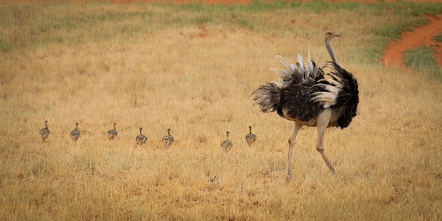 Znajdujemy je po kilku minutach kluczenia wśród wysokich traw. Młode są jeszcze naprawdę małe. Nie sięgają rodzicom nawet do kolan. Posłusznie biegną w rządku śladami taty. Mama zerka gniewnie w kierunku naszego pojazdu rozkładając szeroko skrzydła. Potężnie umięśnione łapy budzą respekt. Podobno jednym kopnięciem potrafią zabić lwa!