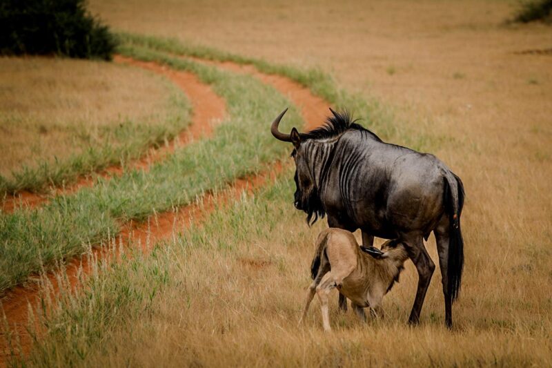 Jeden z malców odłącza się od reszty harcujących młodych i powoli podchodzi do matki. Jest malutki, niemal kruchy, z krótkim, miękkim futerkiem w ciepłym, rudawym odcieniu, który zupełnie nie przypomina przytłumionych, szaro-brunatnych tonów dorosłego gnu. Jego nogi wydają się zbyt długie w stosunku do ciała, a głowa nieproporcjonalnie wielka. Matka cierpliwie opuszcza łeb, pozwalając młodemu przybliżyć się do jej boku. Maluch przysysa się by po chwili wrócić do zabawy.