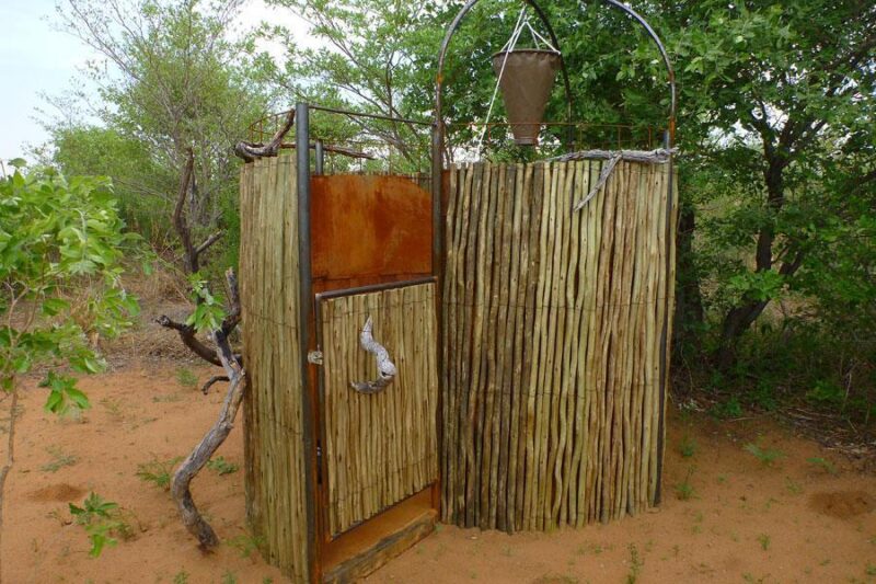 Pole kempingowe okazuje się… miejscem pod drzewem z przypisanym numerem. Do tego suchy prysznic i sucha toaleta w pewnej odległości.